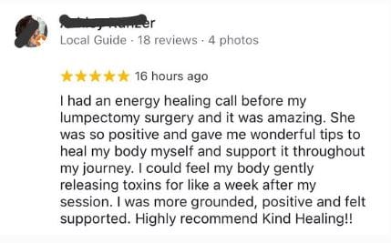 "I had an energy healing call before my lumpectomy surgery and it was amazing. She was so positive and gave me wonderful tips to heal my body myself and support it throughout my journey. I could feel my body gently releasing toxins for like a week after my session. I was more grounded, positive and felt supported. Highly recommend Kind Healing!"