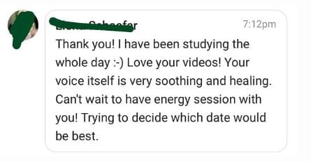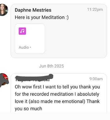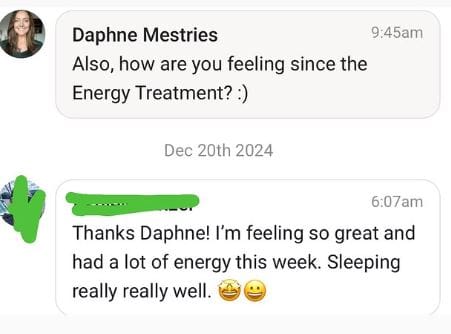 "Daphne is an incredible healer. I went through a lot of challenges last year, like most of us might have gone through and I started getting noticeable symptoms of a burn out (...). I had 2 sessions of distance energy healing which I had never experienced before and soon after I started to sleep through the night, gaining more energy and feeling less gloomy. (...)"