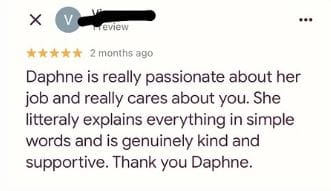 "Daphne is such a kind, patient and knowledgeable woman and professional. I felt guided, supported and understood throughout this journey. The information she shares is straight forward and easy to apply."